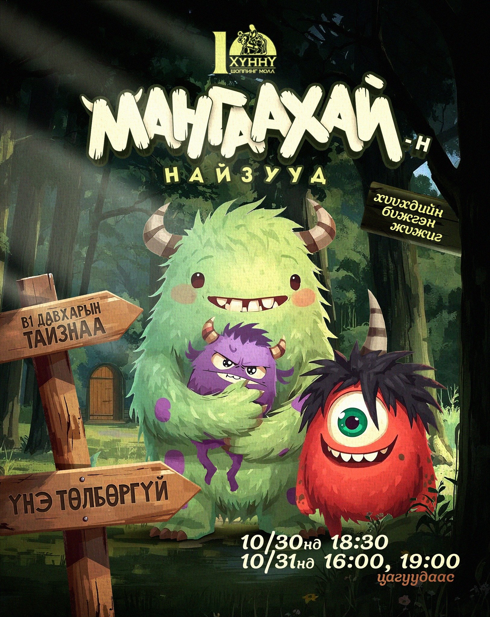 Аз жаргалын өргөө "ХҮННҮ ШОППИНГ МОЛЛ"-н зүгээс "Halloween" аймшгийн баярыг тохиолдуулан хүүхэд багачууддаа адал явдалт "МАНГААХАЙ НАЙЗУУД " бүжгэн жүжгээ В1 давхрын тайзнаа 10 сарын 31-ний өдрүүдэд үнэ төлбөргүй толилууллаа.